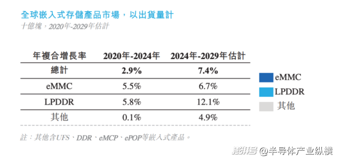 而其中,全球嵌入式存储产品市场规模(以出货量计)从2020年的77亿块增长至2024年的86亿块,年复合增长率达到2.9%。这一阶段的增长主要受到人工智能发展、智能设备、工业自动化以及物联网等因素推动,市场规模持续扩大。预计2024年至2029年,市场将增长至123亿块,年复合增长率为7.4%。
