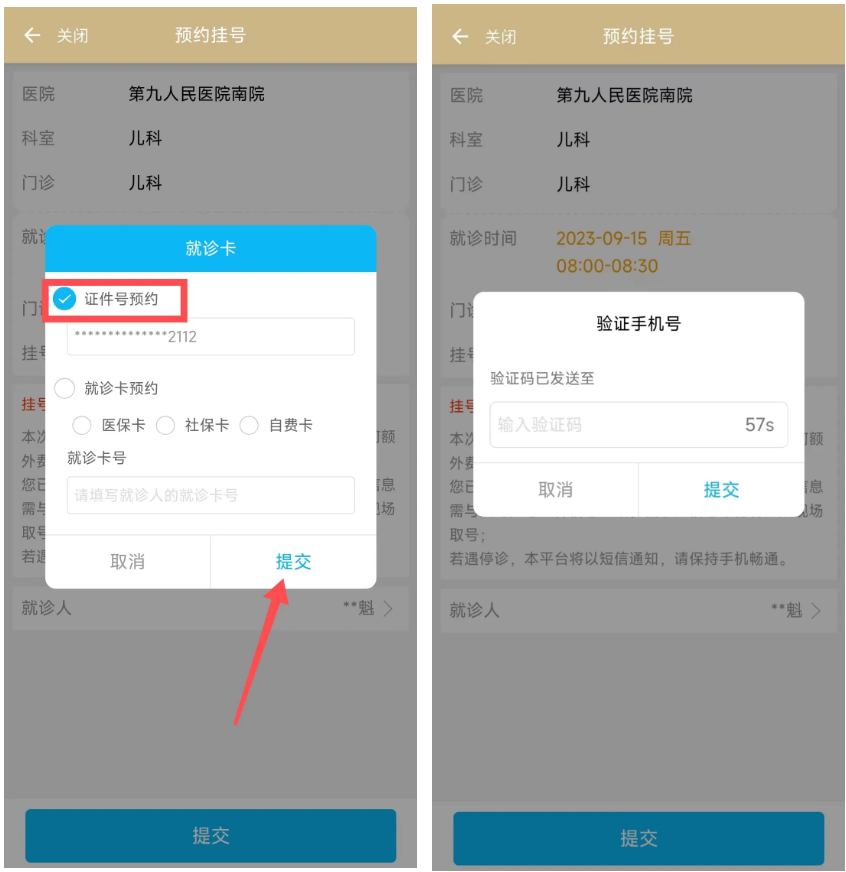 第五步:填写完就诊人信息,请点击“提交”(可选择证件号或就诊卡进行预约),输入收到的手机验证码即可。