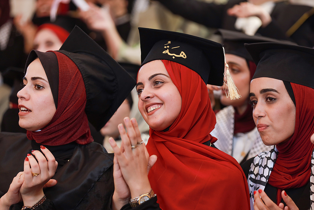 当地时间2025年11月7日,加沙地带汗尤尼斯,150名阿克萨大学英语系女毕业生及其家人参加自冲突爆发以来的首次毕业典礼。