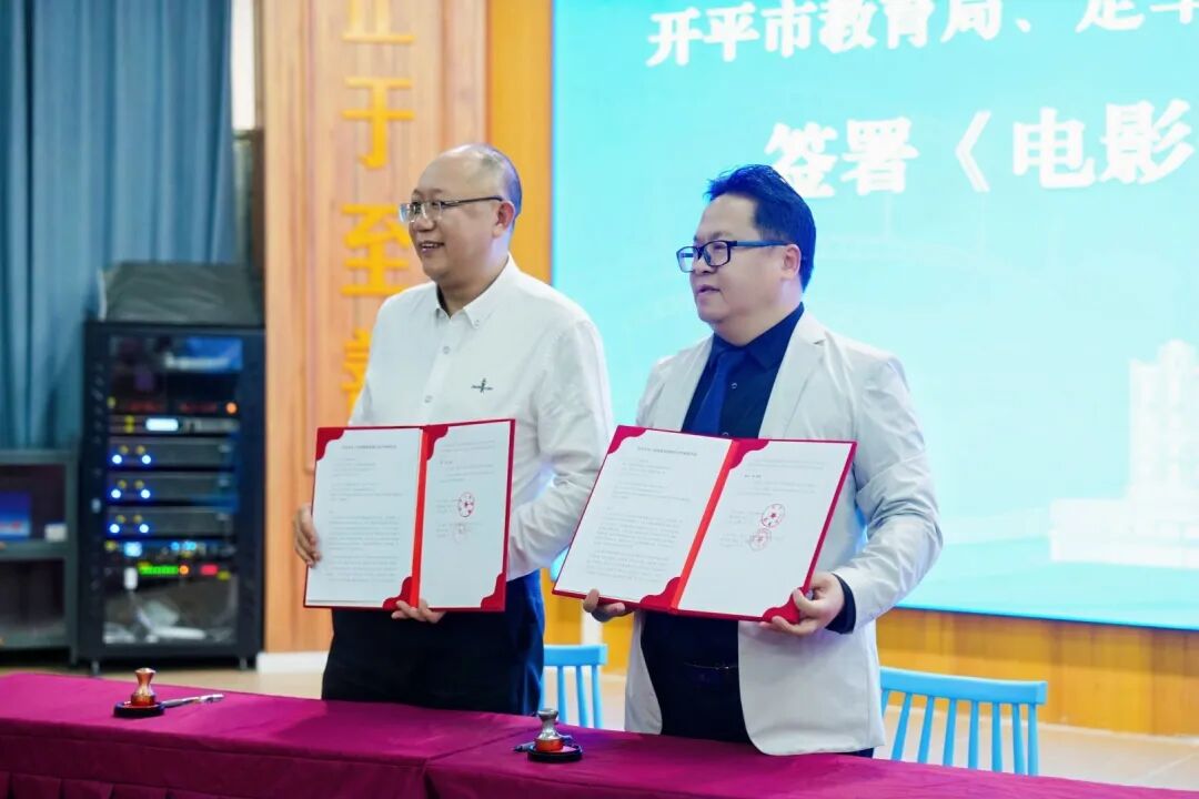 据介绍,项目建设中,深圳市五邑商会捐赠价值1806万元的影视设备及版权内容,定军山公司捐赠价值近120万元的平台与设备。当天启动仪式上,开平市教育局、深圳五邑商会、定军山电影教育科技(深圳)有限公司三方签署《影视教育建设合作协议》;开平市教育局与定军山电影教育科技(深圳)有限公司签署《电影研学实践合作框架协议》;谭宏帙纪念小学与定军山电影教育科技(深圳)有限公司签署《全国艺术(影视)教育实践基地学校影厅捐赠协议》。