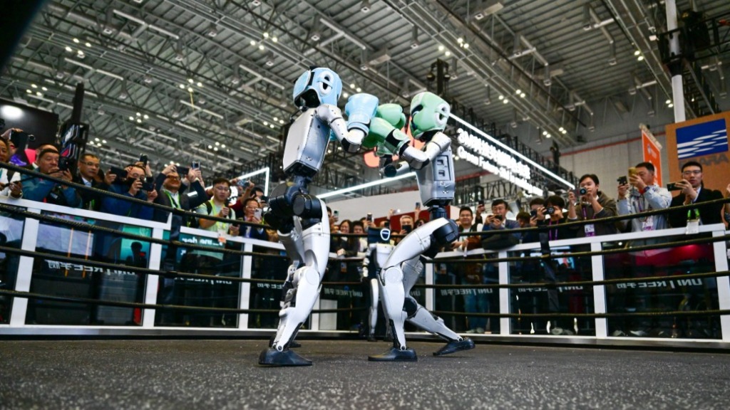 2025年11月6日,在第八届进博会宇树科技展台,人形机器人进行格斗表演。新华社记者 蔡湘鑫 摄