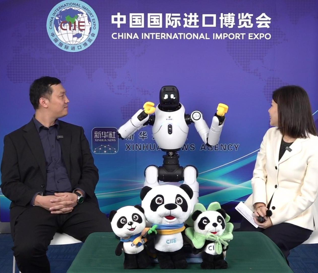 2025年11月5日,第八届中国国际进口博览会,智元机器人带来的灵犀X2机器人惊喜亮相进博会直播访谈间。直播中,机器人不仅畅谈它眼中的未来城市,更在直播现场大秀才艺。新华社 图