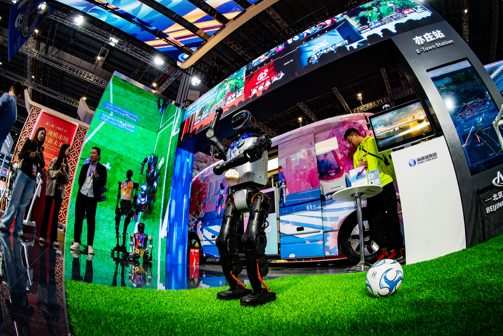 2025年11月8日,第八届中国国际进口博览会,观众在进博会中国馆内观看机器人足球表演。视觉中国 图