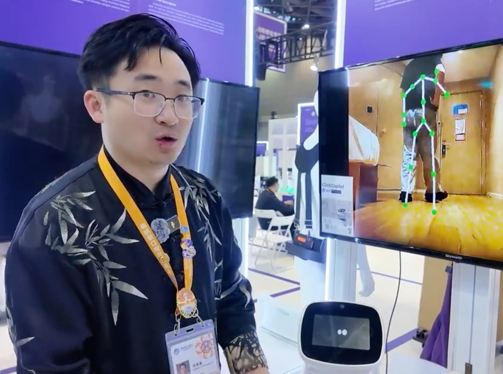 这是今年进博会新带来的一款家庭主动陪伴机器人。希望能够在老年人的生活当中,有一个智慧的聪明的小伙伴,然后能够主动地去找到用户,跟他进行交流和沟通。