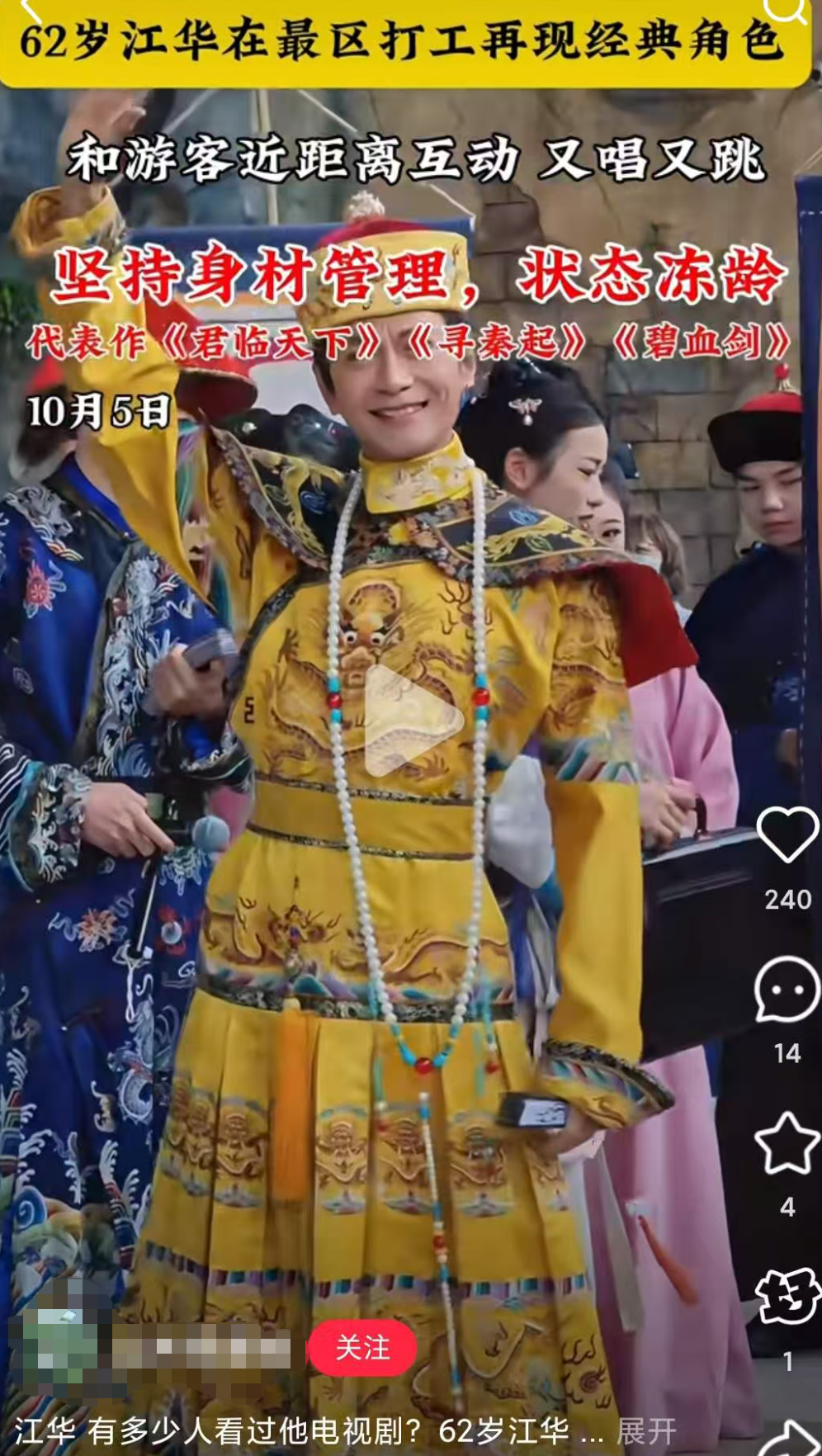 近来,一批曾活跃在荧幕上的熟悉面孔,突然出现在全国多个景区,成为网友热议的“明星NPC”,比如“帝王专业户”郑国霖、“老爷专业户”寇振海、TVB演员马景涛、李国麟、江华等。穿上戏服,他们化身影视剧中的经典角色,与来自五湖四海的游客沉浸式互动。明星NPC既是景区为吸引游客策划的营销噱头,亦是在影视寒冬之下,一批中老年演员另寻出路的缩影。在短剧冲击、投资收缩、优质剧本稀缺的背景下,不少曾经家喻户晓的演员,正面临“无戏可拍”的现实困境。而景区NPC,成了一种既延续表演专业、又维持体面,且回报可观的“再就业”方式。对于这些演员而言,在景区做“日结兼职”不仅是一份“来钱快”的工作,更是在行业夹缝中寻回“被需要”的职业尊严。景区提供了舞台和观众,他们也以专业技能为景区带来活力与效益,形成一种彼此成全的共生关系。