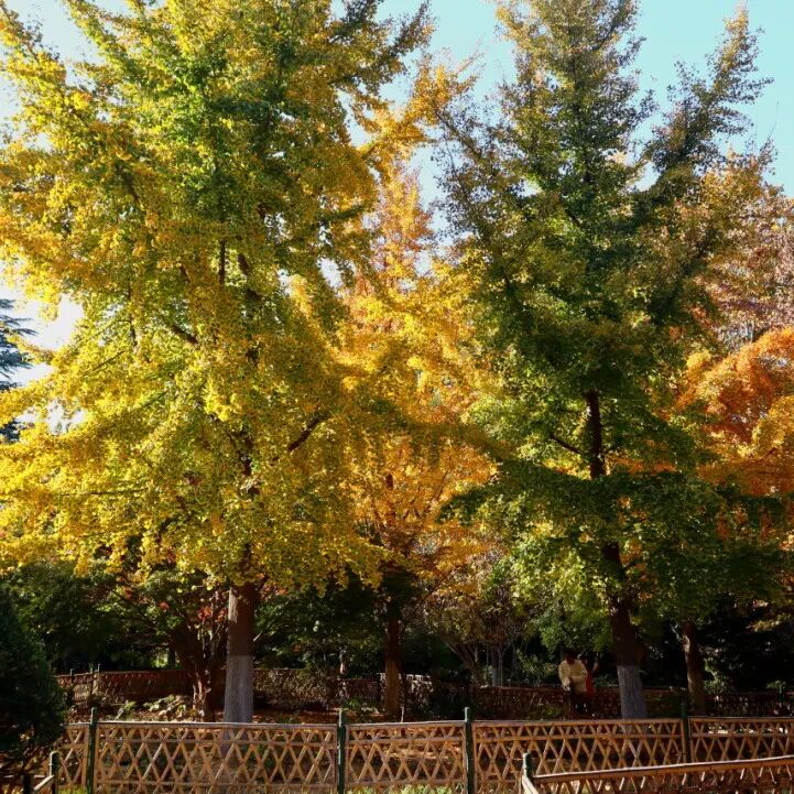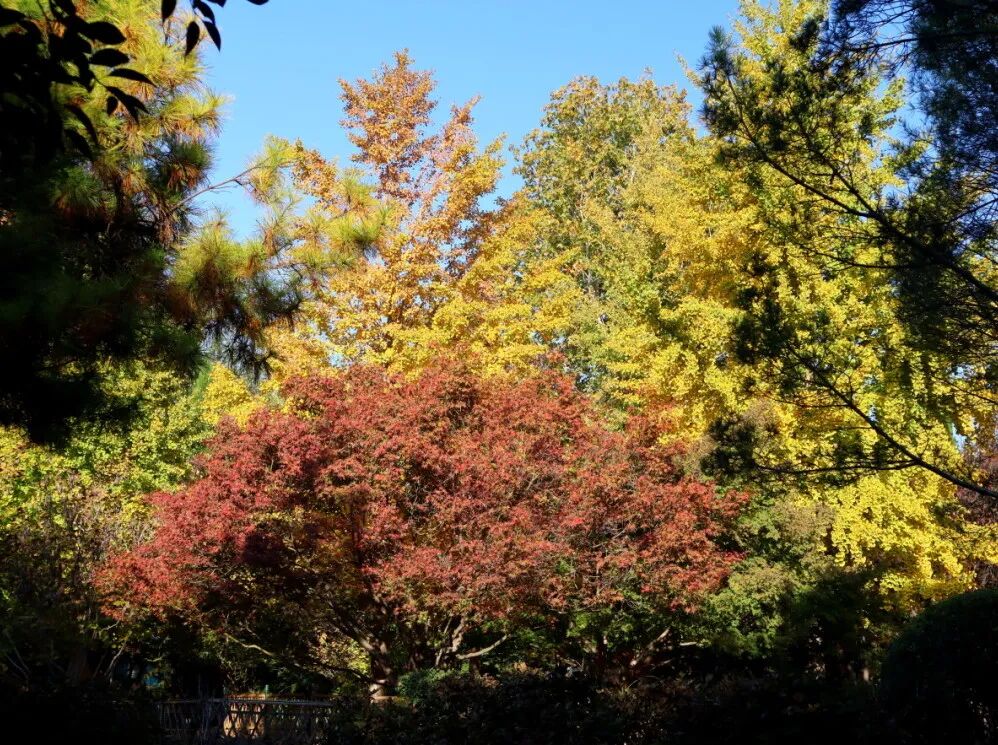 此时的公园,宛如一幅层叠渐变的暖色画卷。银杏叶铺就金色地毯,枫树摇曳着赤红与橙黄,而常青的松柏则点缀其间,形成冷暖交织的视觉层次。