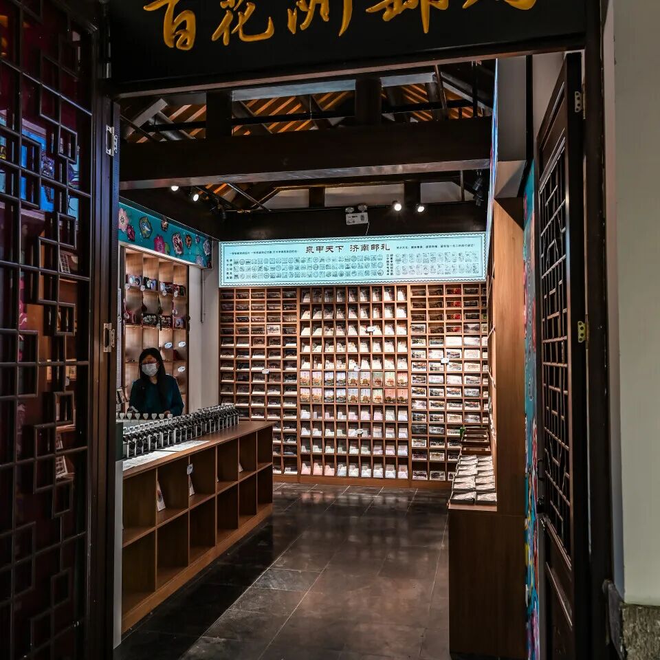 这是一家颜值很高的书店,为百花洲增添了浓厚的文化气息。店内销售畅销图书和线装书籍,同时设有销售明信片为主的小邮局。明信片上有上百种泉城风光,现场还有70多枚特色印章,内容涉及泉城新八景、十大泉群、老商埠建筑等,可以在泉城特色明信片上盖章,留下泉城旅游的美好记忆。