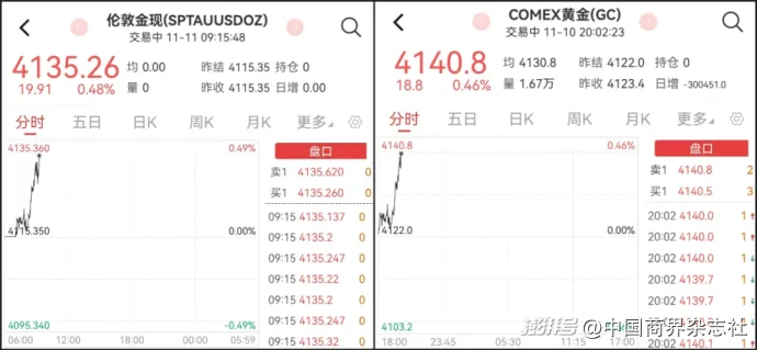 11月11日,国际金价延续强势。截至发稿,现货黄金盘中突破4130美元/盎司,现报4135.26美元/盎司,涨幅0.48%;COMEX黄金期货突破4140美元/盎司,现报4140.8美元/盎司,涨幅0.46%。