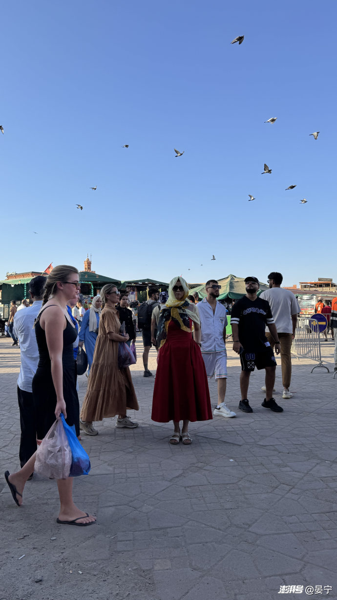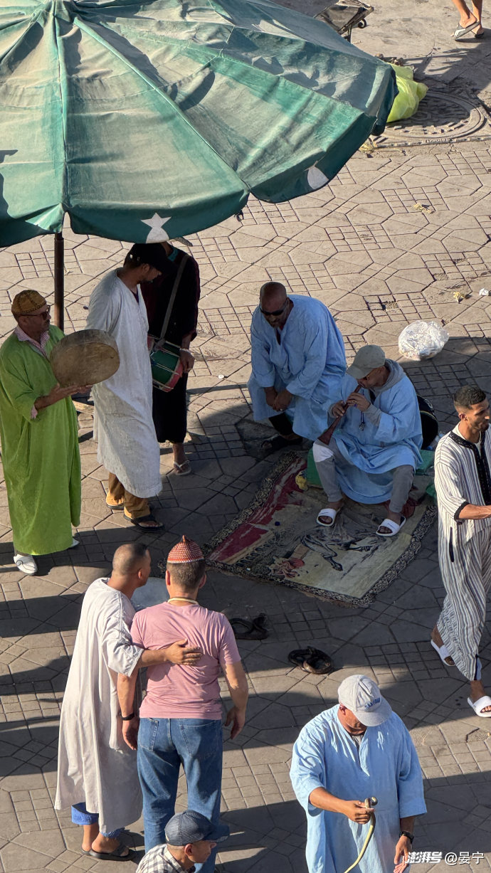 坐在咖啡馆二楼的露台上,俯视着广场上形态各异的帐篷,像一处吉普赛人的营地,华灯未上,所有的一切都在阳光下无所遁形,游客拖着长长的影子,悠然漫步,小贩推着满车的薄荷匆匆走过,广场的一角仍在建设中,挖掘机的轰鸣、柏柏尔艺人的乐声、叫卖吆喝、耍蛇人的笛声、宣礼塔上传来的悠长祷告……种种声响交织在一起,构成一种与东方无甚关联的“东方风情”。