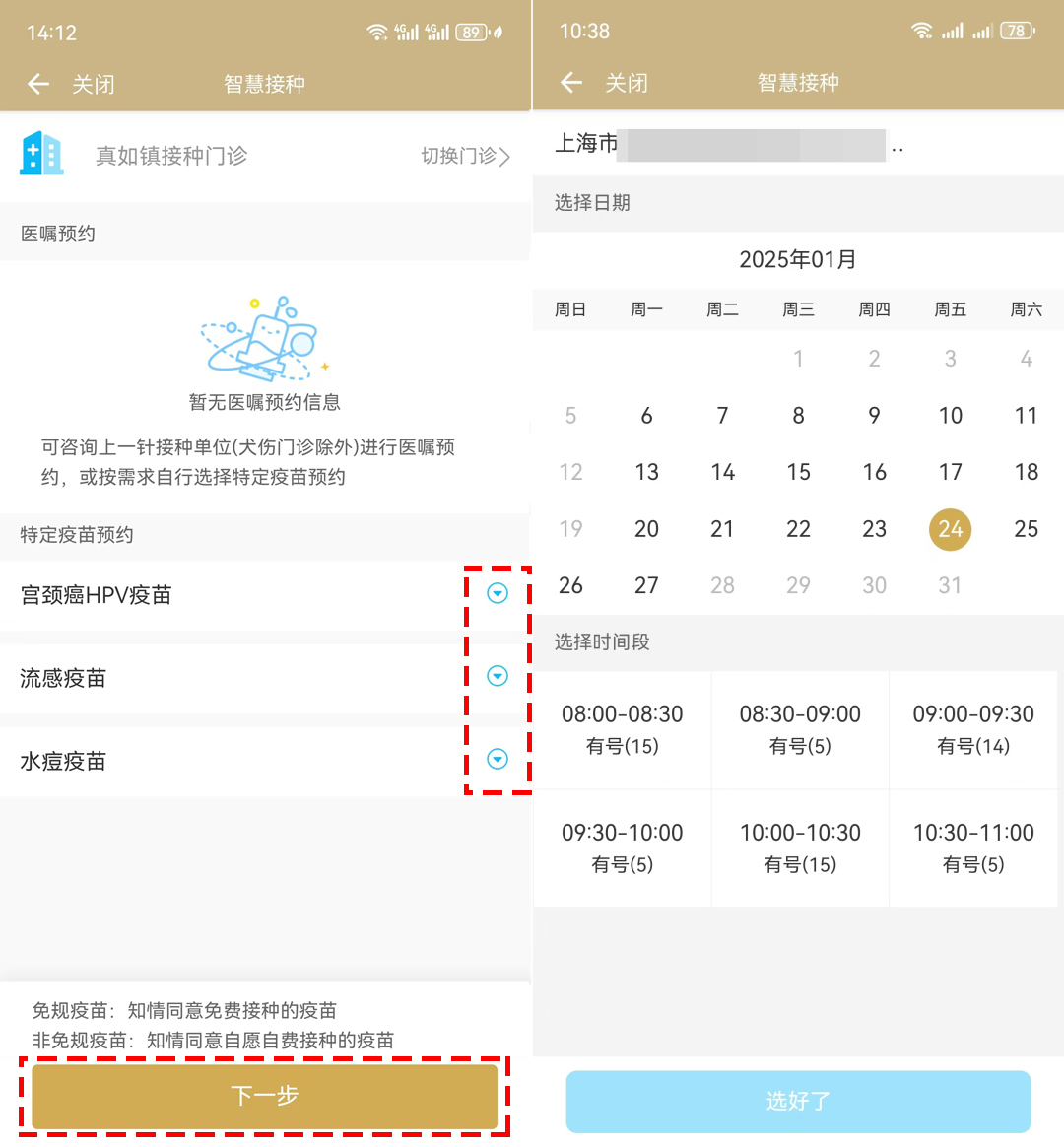 选择受种者需要预约的疫苗、接种点信息后,点击“下一步”→选择受种日期和时间;