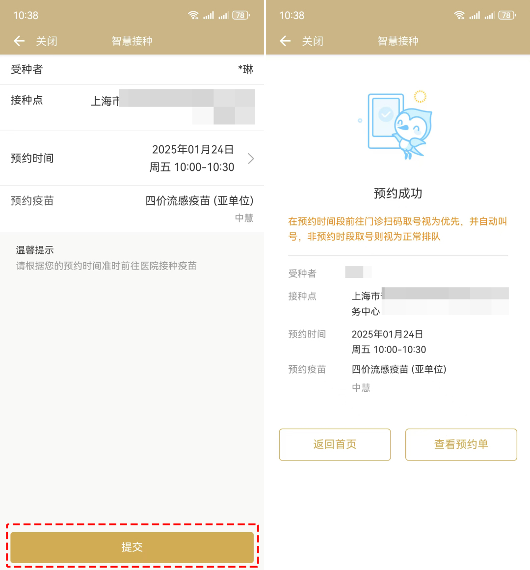 确认受种者信息、接种点、预约时间、预约疫苗信息后,点击“提交”,完成预约。