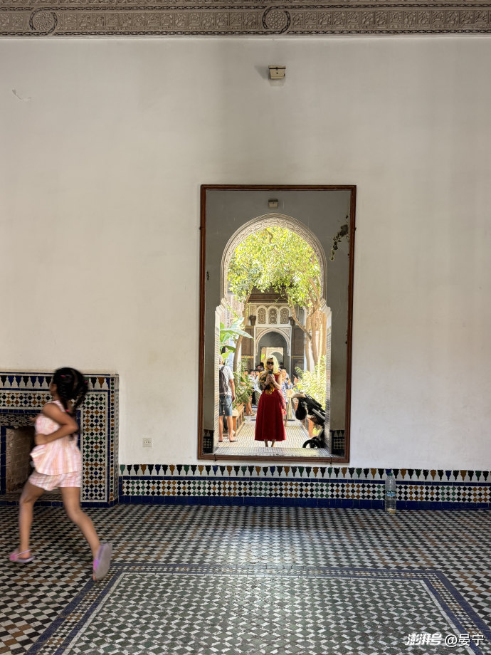 我坐在巴齐亚宫清凉的天井里休息,一位气质儒雅的中年解说员自然地坐到我身边。我翻开手机里的照片,指着那一串由小三角形和圆点组成的图案问他:“这是什么文字?”他看了一眼,轻声答道:“哦,柏柏尔文,这是柏柏尔字符(Berber character)。”