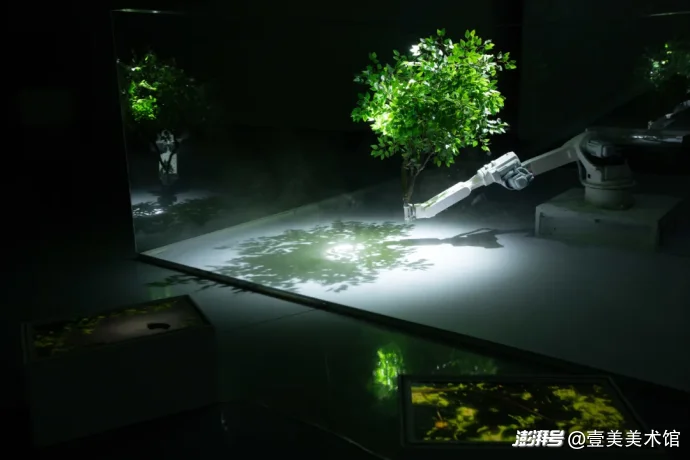 2020年以来,陈抱阳的创作进入多智能体共生阶段,实现了对艺术生态的重启。他从单一技术实验转向复杂系统的搭建,这一转变背后是对“生态共生”与“技术伦理”的哲学思考。《追逐迷雾》中,两辆AI驱动的汽车在“战争迷雾”里相互追逐,观众通过交互台放置虚拟障碍物影响智能体行为。作品不再是艺术家单向输出,而是多主体互动演化的动态系统。这种互动创作模式,打破了传统创作中的单向传递,在互动中生成了意义网络,重启在此成为“打破艺术创作的主体垄断”的手段,让艺术从“艺术家的个人表达”走向“多主体的共生叙事”。《第一森林定律》的指向更为尖锐。AI系统控制机械臂为植物提供“完美生长环境”,却因故意设置的“错误参数”,导致机械臂频繁升降树木,最终至其死亡。这是对“技术救世论”的重启。作品打破“技术能解决一切矛盾”的想法,因为当技术脱离对自然本质的理解,即便初衷向好也可能引发灾难。这是陈抱阳对AI时代的怀疑和警醒。机械臂“好心办坏事”的现场,将问题具象化:若缺乏伦理和约束,缺乏对“存在本质”(如植物生长的自然规律)的尊重与敬畏,技术就可能成为破坏的力量。而重启的意义,正在于通过这种批判性反思,让技术服务于存在,而不是成为支配存在的工具。
