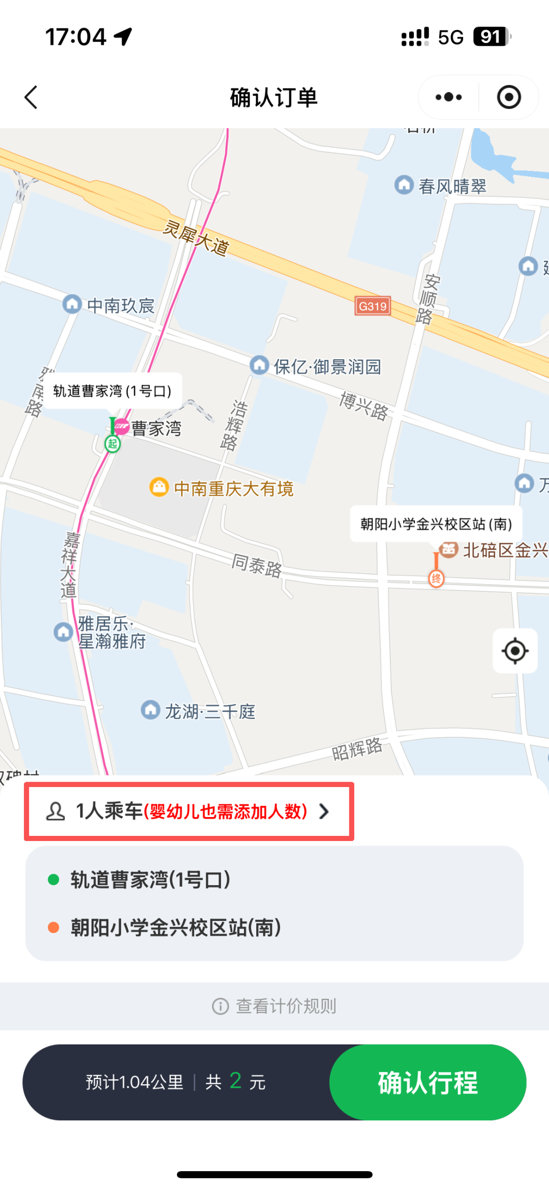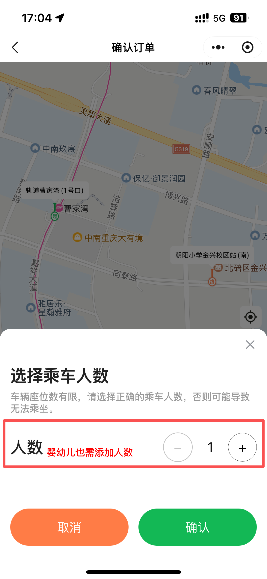 2.选择上车点和目的地,输入人数,系统自动派车并显示车辆信息;