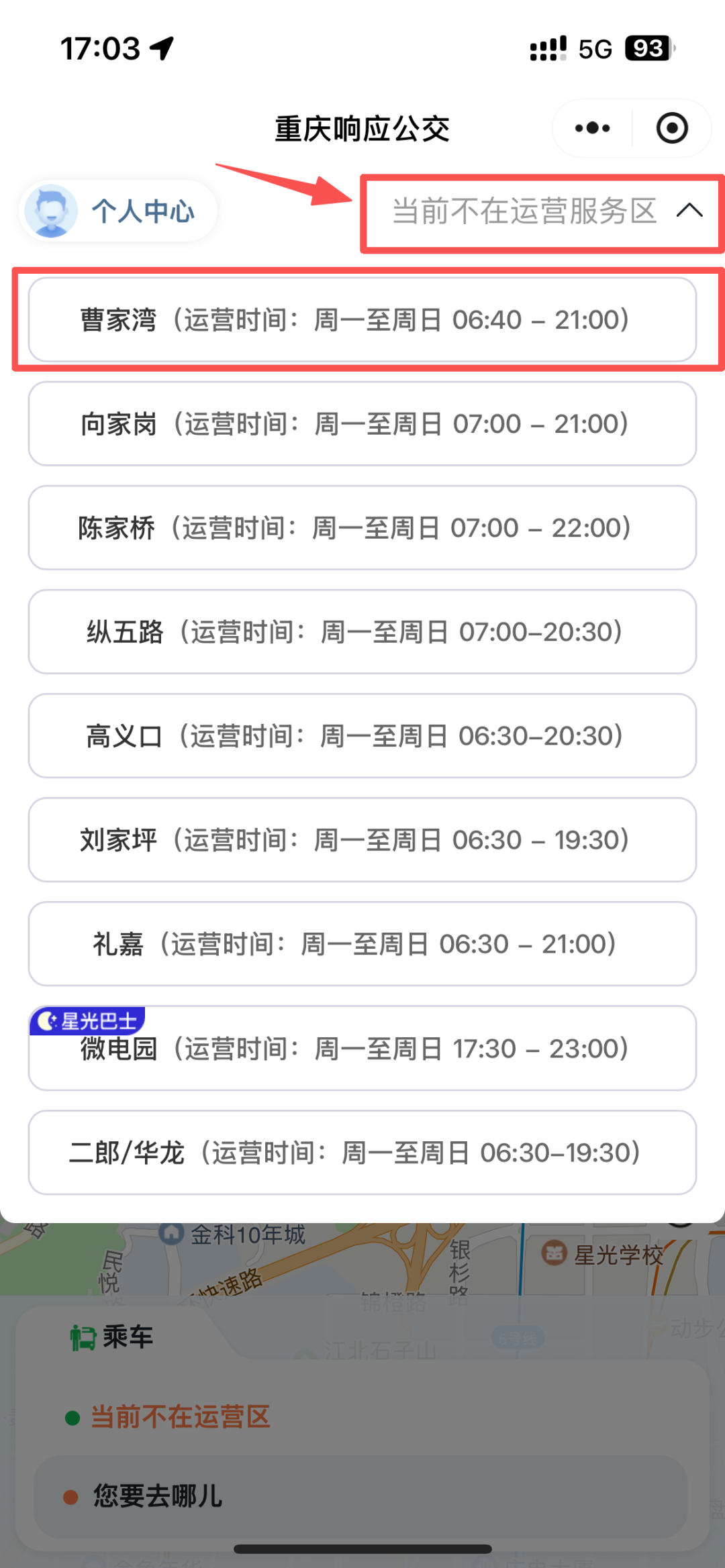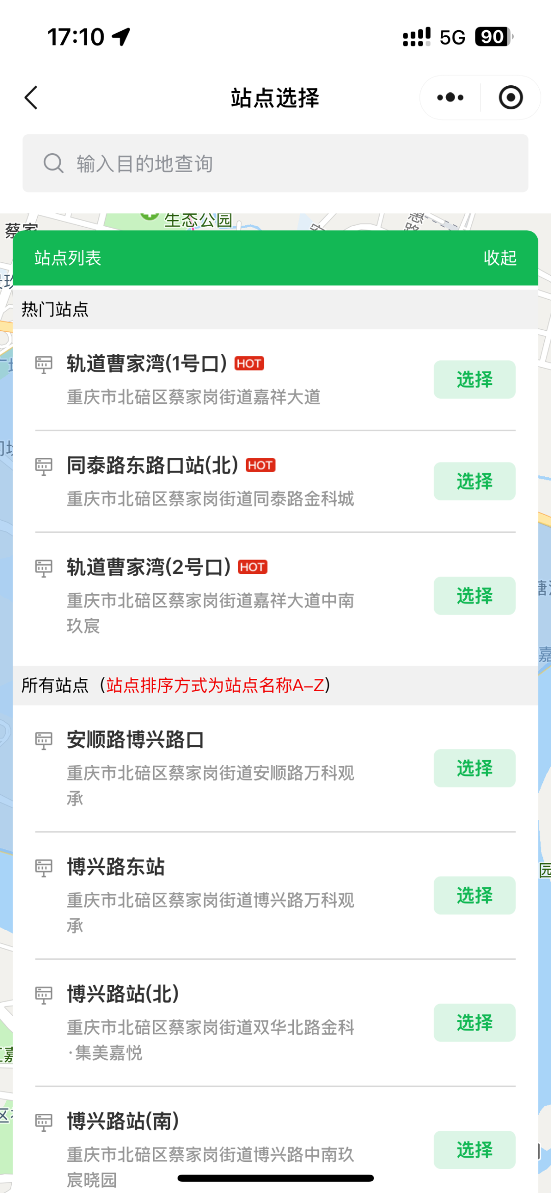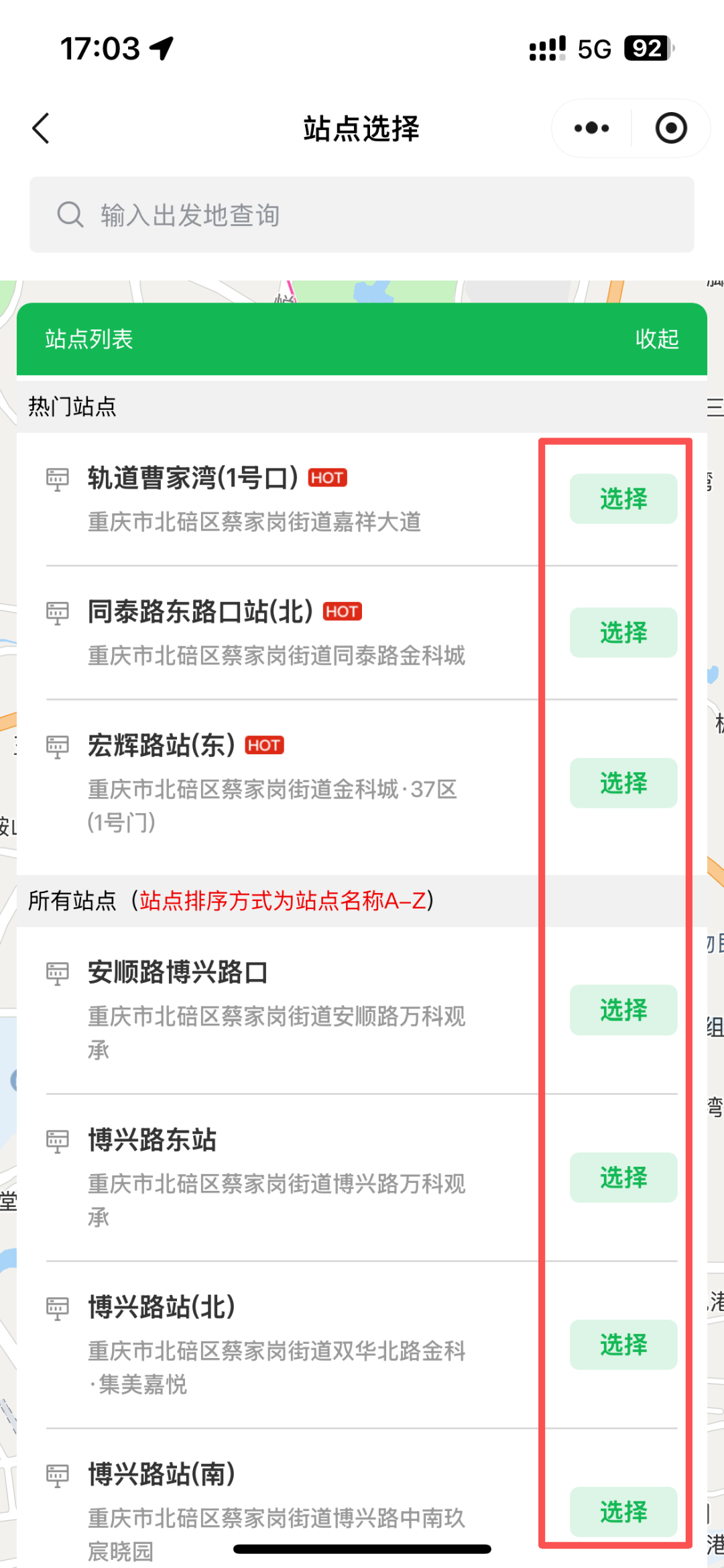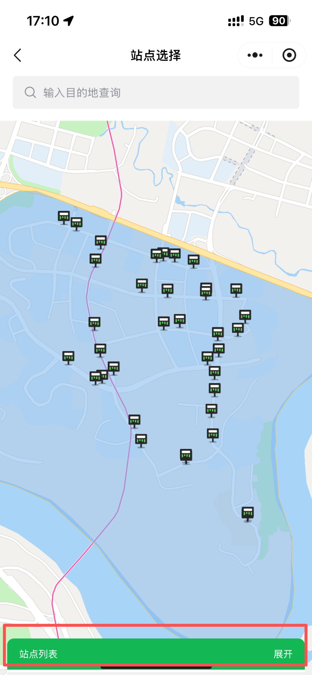 在小程序中选择运营区域后,点击 “您要去哪儿” → “站点列表”,即可查看该线路所有停靠站点。