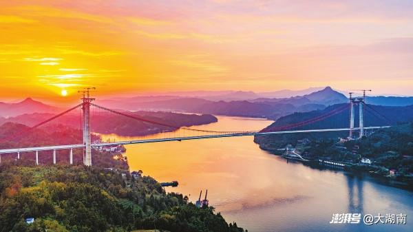 11月12日傍晚,位于湖南省怀化市沅陵县境内的G59张(家界)官(庄)高速控制性工程洞庭溪沅水特大桥进入桥面铺装阶段。该悬索桥主跨800米,为我省在建最大跨径悬索桥。田文国 摄
