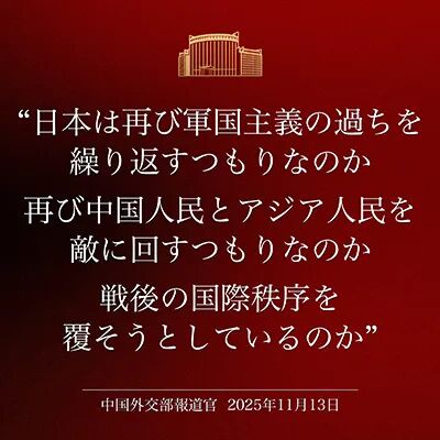 11月13日,外交部官方账号在社交媒体X平台连发六张海报,使用日英双语警告高市早苗。