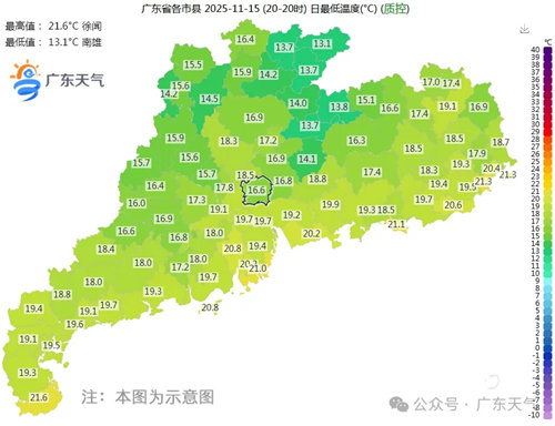 16日,粤西市县多云,其余大部分市县晴到多云。最低气温:粤北和珠三角北部市县15~18℃,其余大部分市县19~22℃。