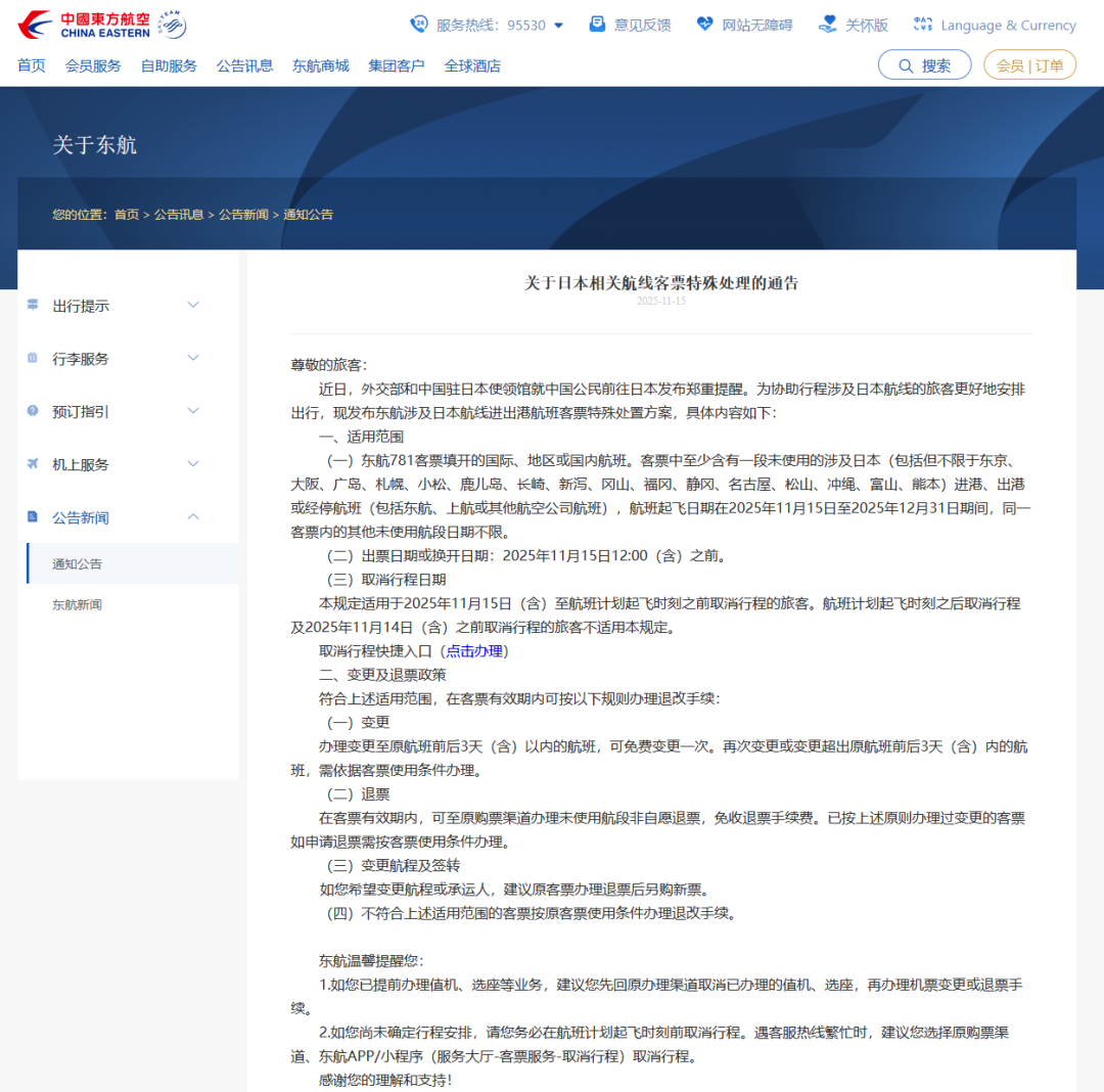 东航在通知中明确,对于在今年11月15日12:00(含)前购买或换开的东航781客票填开的国际、地区或国内航班。客票中至少含有一段未使用的涉及日本(包括但不限于东京、大阪、广岛、札幌、小松、鹿儿岛、长崎、新泻、冈山、福冈、静冈、名古屋、松山、冲绳、富山、熊本)进港、出港或经停航班(包括东航、上航或其他航空公司航班),航班起飞日期在2025年11月15日至2025年12月31日期间,同一客票内的其他未使用航段日期不限,办理变更至原航班前后3天(含)以内的航班,可免费变更一次。再次变更或变更超出原航班前后3天(含)内的航班,需依据客票使用条件办理。在客票有效期内,可至原购票渠道办理未使用航段非自愿退票,免收退票手续费。