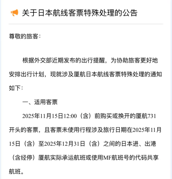 南航在通知中明确,对于在今年11月15日12:00(含)前购买或换开的南航784开头的客票,且客票未使用行程涉及旅行日期在2025年11月15日(含)至2025年12月31日(含)之间的日本进、出港(含经停)南航实际承运航班或使用CZ航班号的代码共享航班,航班起飞前取消已定妥座位的旅客,在客票有效期内申请退票,免收退票费。首次变更至相同航程的南航实际承运航班,免收变更费,如发生票价价差按规定收取。
