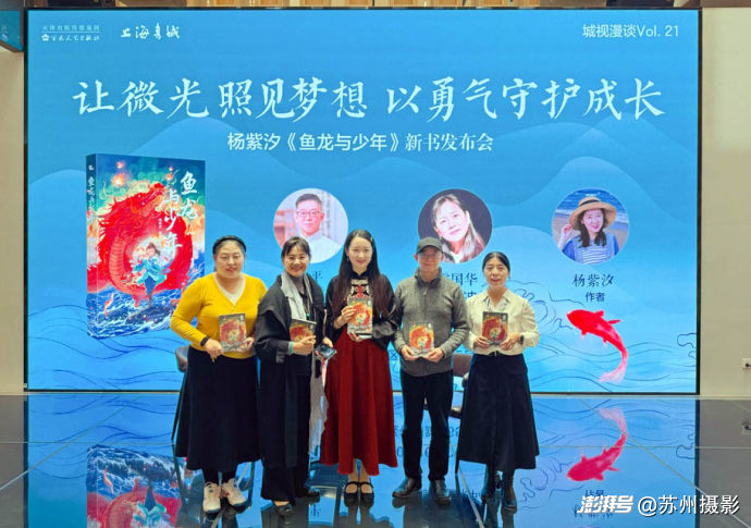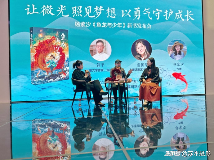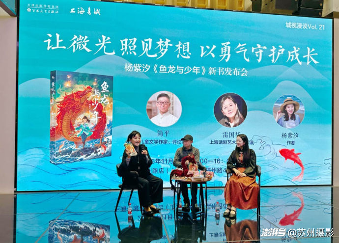 11月16日下午,上海国际童书展期间,由百花文艺出版社与上海书城联合主办的“让微光照见梦想 以勇气守护成长——杨紫汐《鱼龙与少年》新书发布会”在上海书城成功举办。著名儿童文学作家、评论家简平先生,上海话剧艺术中心国家一级导演、上海戏剧学院导演系客座教授及研究生导师雷国华女士,以及本书作者杨紫汐女士作为嘉宾出席了本次活动。活动围绕《鱼龙与少年》的创作背景、文化内涵、艺术特色进行了精彩对谈。