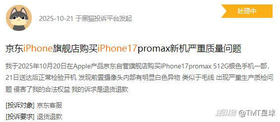 比如,有网友在黑猫投诉平台投诉称,其在Apple京东自营旗舰店购买的iPhone 17promax版手机,正常开机发现前置摄像头内部有明显白色异物,怀疑“出现严重生产质检问题”。