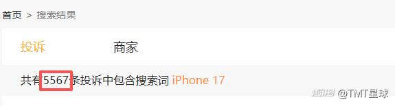 「TMT星球」又以“iPhone 17”为关键词在黑猫投诉平台进行检索,结果显示,相关投诉量高达5567条,主要集中在产品有质量瑕疵、货不对板、超期不发货、售后服务差等方面。