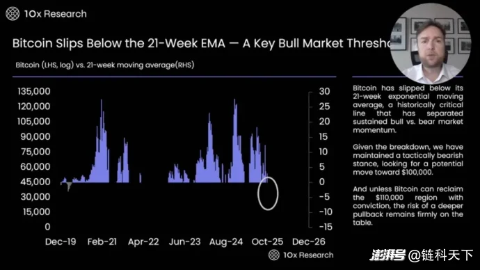 技术指标亮起红灯:根据 10x Research 的分析,比特币价格已跌破 21 周指数移动平均线(EMA),这在历史上通常被视为进入“小型熊市”的关键信号。同时,短期持有者的实现价格(平均买入成本)已高于当前市价,意味着近期入场的投资者普遍处于亏损状态,这极大地增加了市场的“投降式抛售”风险。分析师设定了一个关键的看空/看多分界线:只要价格低于 113,000 美元,市场就面临较大的下行风险。