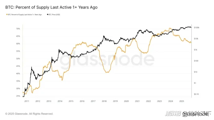 富达的 Kuiper 指出,这并非恐慌性的抛售,而更像是一场“持续的、缓慢的流血”。他引用的 Glassnode 数据显示,“一年以上未活跃的比特币供应百分比”这一指标,在过去的牛市中通常会急剧下降,意味着老玩家们在高点获利了结。然而,本轮周期中,该指标的下降曲线却异常平缓。这表明长期持有者正在有计划、分批次地将手中的筹码转移出去。