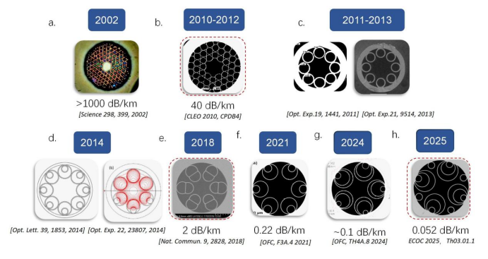 从2019年到2023年,反谐振空芯光纤的舞台属于南安普顿大学。他们获得数亿英镑的资助,大力发展空芯光纤及通信应用,几乎每年都在OFC或ECOC以PDP形式刷新损耗纪录(图1f),并在2024年将损耗降低到了0.1 db/km(图1g),打破了传统石英光纤的损耗记录。而那几年,我们团队因为工作调动和有限的经费,更多是作为一个跟随者。