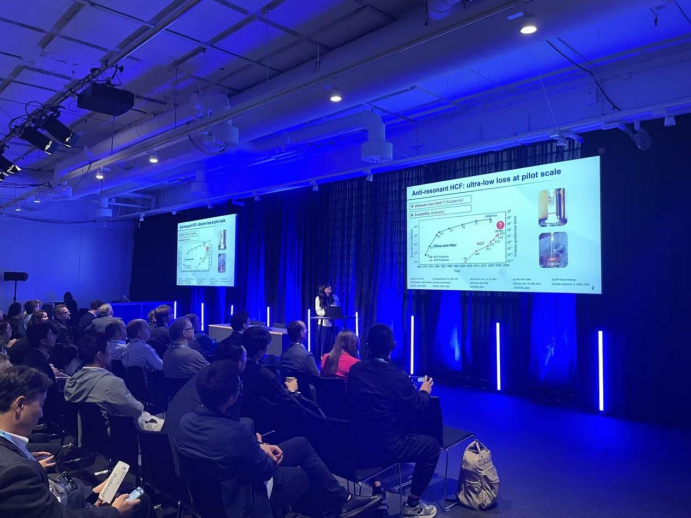 巧合的是,领纤的成立时间恰逢空芯光纤在中国落地的开端。2024年,我认为是中国空芯光纤的元年。6月份,中国移动启动了国内首个空芯光纤光缆项目试点,我们是重要的参与方,我们铺设的空芯光纤性能位居当时国内第一。9月份,我们又携手中国移动完成了世界首个<0.14 dB/km的光缆铺设,并在欧洲光通信会议(ECOC)做了PDP报告(Field-Deployed Hollow-Core Fibre Cable with 0.11 dB/km Loss)(图2),让世界认识了领纤和空芯光纤的中国力量。