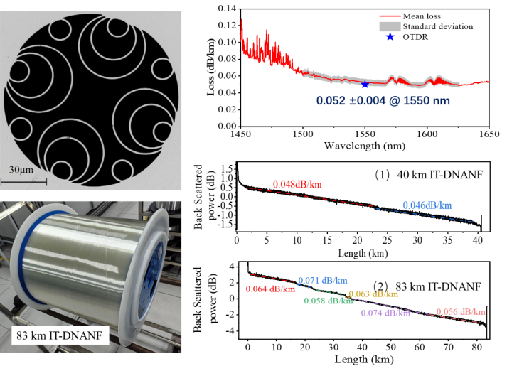 我们这一工作正是要直面空芯光纤的量产瓶颈,给出可行的方案。具体细节已有前期报道(图4所示),在此仅总结结论:我们设计的间隙管辅助空芯光纤(图1h)创造了两项新纪录——83 km单次拉制长度,实现了空芯光纤有史以来最长的单跨拉丝;0.052 dB/km超低损耗,创下迄今为止所有类型光纤的最低衰减。