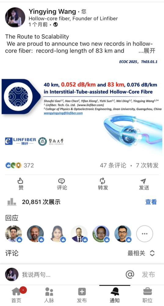 一个有意思的插曲是,贝尔实验室的David Neilson教授在听完我的报告后,在Linkedin上@我问:”time to start using milli dB per km?” 下面很多人回复讨论是该用“mB/km”还是“dB/Mm”。这样有趣的探讨,正源于空芯光纤对实芯光纤的“颠覆”——或许连“dB/km”这个单位,都快无法满足空芯光纤的损耗降低趋势了。