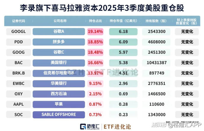 李录执掌的喜马拉雅对谷歌配置最为显著,合计持仓占比达37.62%,其中谷歌A类股占比19.14%、C类股占比18.48%,持仓规模约12亿美元,且三季度持股数量均保持不变。