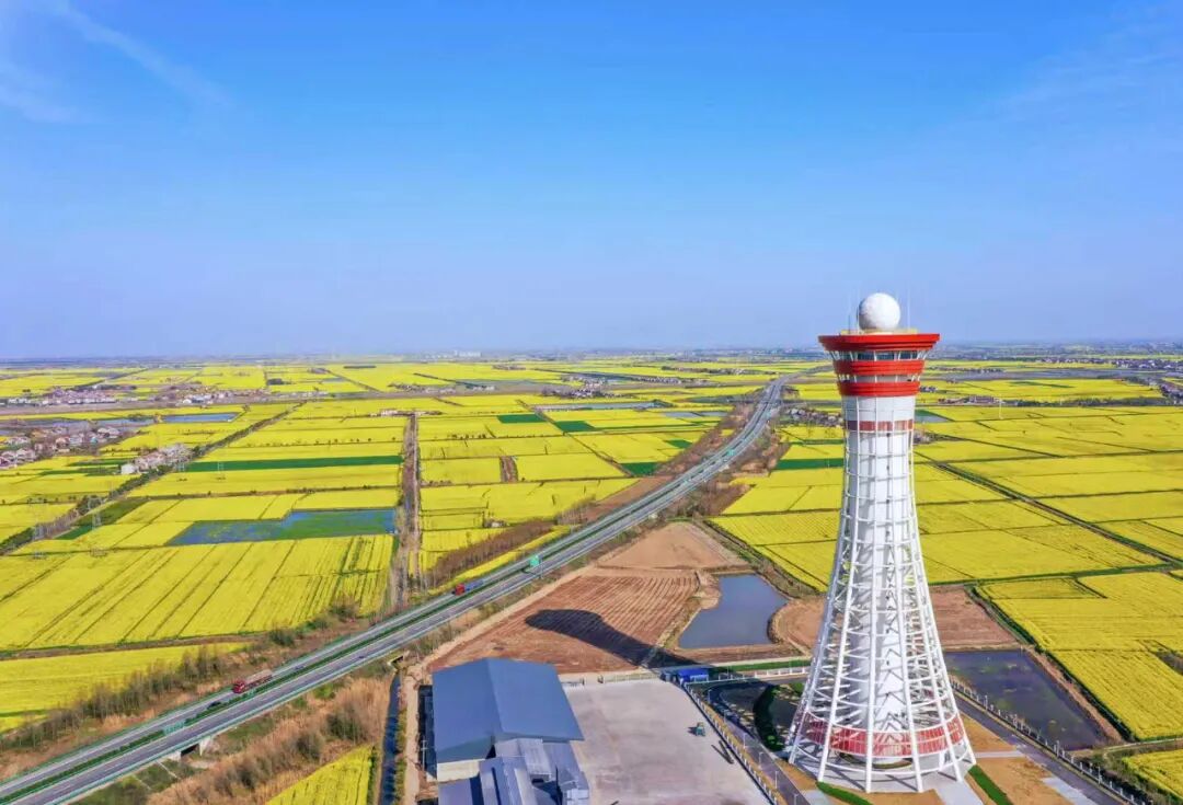 矗立在油菜花海的荆州S波段新一代天气雷达。供图:湖北省气象局