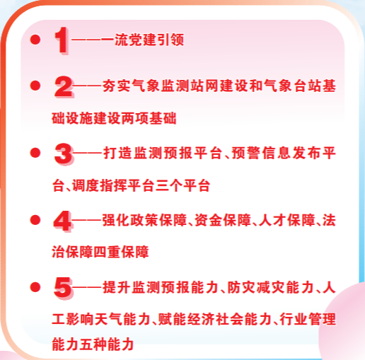 勇向潮头立——推进气象高质量发展,重在基层、难在基层。聚焦基层气象高质量发展“干什么、怎么干”,湖北省气象局坚持谋实、做实、求实,在广泛调研、深入研究的基础上,明确加快推进市县气象高质量发展的实施方案,系统性提出“12345”发展思路(即一流党建引领;夯实气象监测站网建设和气象台站基础设施建设;打造监测预报平台、预警信息发布平台、调度指挥平台;强化政策保障、资金保障、人才保障、法治保障;提升监测预报能力、防灾减灾能力、人工影响天气能力、赋能经济社会能力、行业管理能力),从15个方面明确具体任务、目标、措施和方法,绘就了湖北基层气象高质量发展施工蓝图。