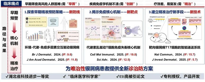 银屑病作为常见的慢性炎症性系统性疾病,其反复发作的鳞屑性红斑、关节等多组织损害及高共病负担导致生物制剂疗效受限。针对以上临床困境,团队构建了环境-代谢-免疫多因素预警体系,为早期识别高危人群提供了关键工具;深入揭示了肥胖等共病如何驱动T细胞免疫失衡导致病情加重和治疗抵抗,找到了逆转耐药的新靶点;并创新性开发出智能微针递送系统,实现了对病灶的精准靶向治疗,在显著提升疗效的同时有效阻断复发,为银屑病的治疗建立了“局部免疫调控-精准防治复发”的新策略。这一系列创新成果取得了从疾病预警到精准治疗的全链条突破,为难治性银屑病患者提供了全新的诊治防方案,对提升患者生活质量和推动炎症性皮肤病诊疗进步具有重要意义。