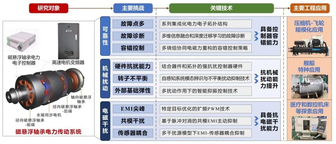 磁悬浮轴承在电力电子驱动下实现主动无接触支承,是工业和国防领域高速电力传动的颠覆性技术。但是其安全稳定运行面临故障失效、机械扰动、电磁干扰的巨大挑战,成为制约磁轴承技术应用的长期瓶颈。团队融合机-电-智学科交叉,取得如下技术创新与突破:突破了磁悬浮轴承可靠性容错技术,实现电力电子器件开路和短路故障的在线诊断与容错;提出了磁悬浮轴承电力传动系统自感知的机械扰动抑制技术,大幅提升磁悬浮轴承电力传动系统的悬浮运行品质;建立了磁悬浮轴承电力传动系统电磁干扰主动抑制体系,有效应对应用中电磁兼容挑战。在此基础上,团队进一步突破了磁悬浮轴承智能化和重载磁悬浮轴承的前沿技术。该项目研制了部件级-装备级-系统级高可靠强抗扰磁悬浮轴承电力传动系列装置,实现压缩机和飞轮等规模化产业应用、舰船特种应用,以及数控机床和医疗CT等新领域探索应用,经济和社会效益显著。