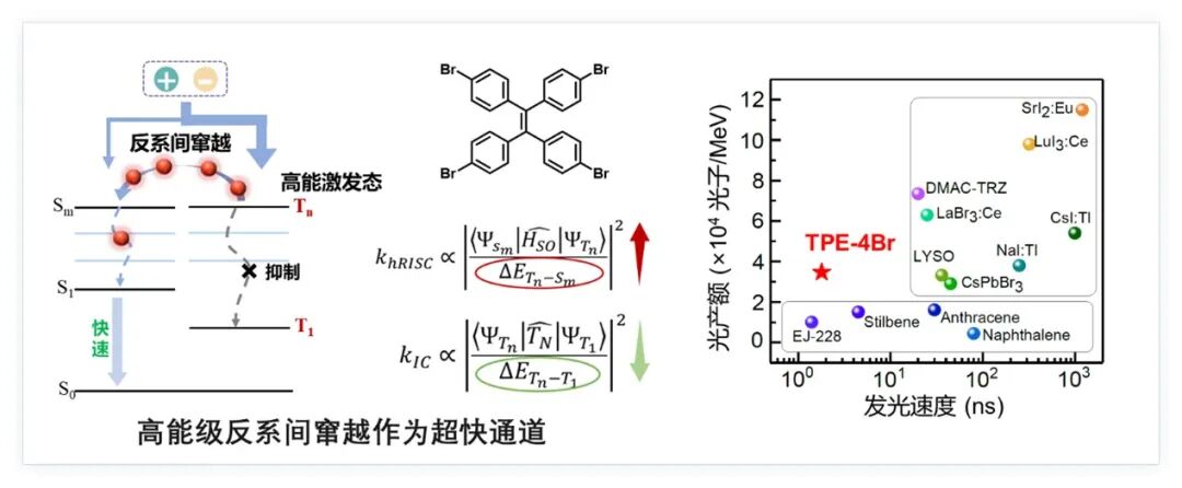 核辐射探测是对X/γ射线、中子、带电粒子等的测量,广泛应用于考古分析、高能物理、医疗等领域。核辐射探测的重要发展方向是不断提升时间分辨率:比如,激光核聚变以及核医学正电子发射断层成像都需要探测器具有纳秒甚至更快的响应速度,以实现早期诊断。项目组围绕时间分辨率问题,首次提出超快热激子闪烁探测新原理,突破闪烁体数十年的性能瓶颈:利用高能级反系间窜越机制,抑制了慢速三线态的产生,实现超快响应(1.79ns)、高光产额(34600光子/MeV)的热激子有机闪烁体,成像帧率达到10000帧每秒。该成果有望用于核聚变测量、同步辐射等相关应用,样品已被欧美及国内相关单位采购并试用。
