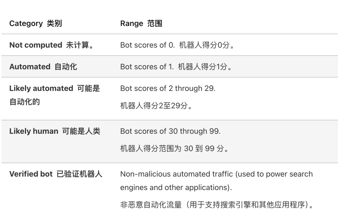 Cloudflare有个功能叫BotManagement(机器人管理),它不光能识别出恶意机器人bot,还能给每个访问者打分。