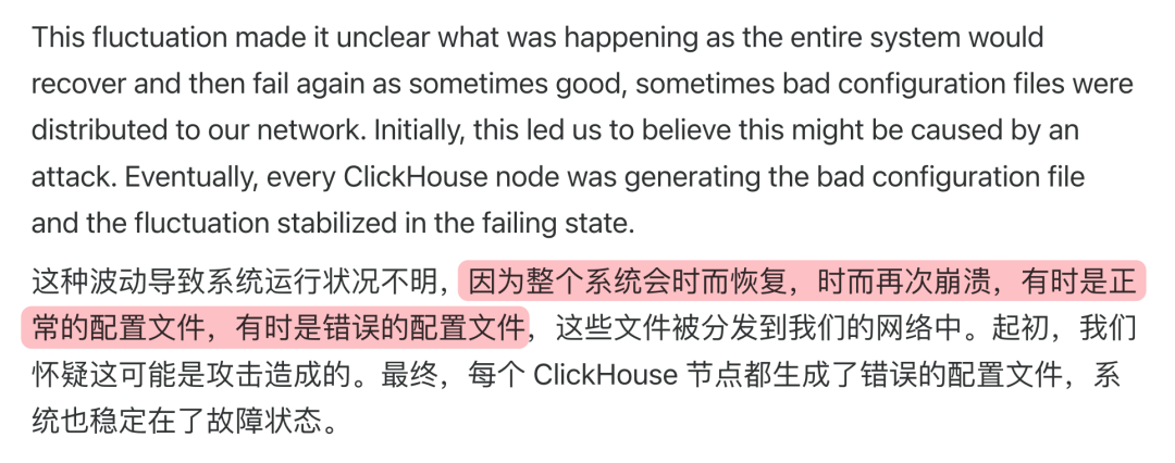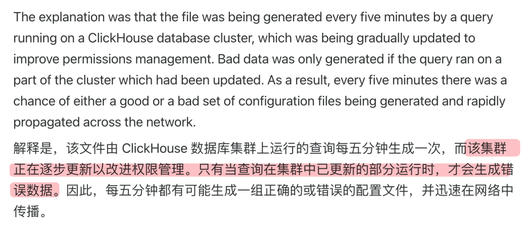 于是14:24,他们赶紧停止自动生成新配置文件,手动翻出一个之前能正常工作的旧版本,测试确认没问题,然后推送到全球所有服务器,大部分服务开始恢复。