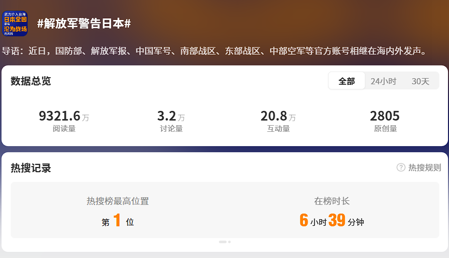 11月19日,话题“解放军警告日本”登上热搜第一。