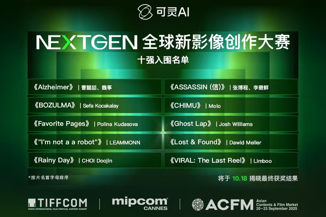 10月18日,由可灵AI主办的NEXTGEN全球新影像创作大赛正式揭晓获奖名单,从全球4600余个投稿中筛选10部获奖作品。