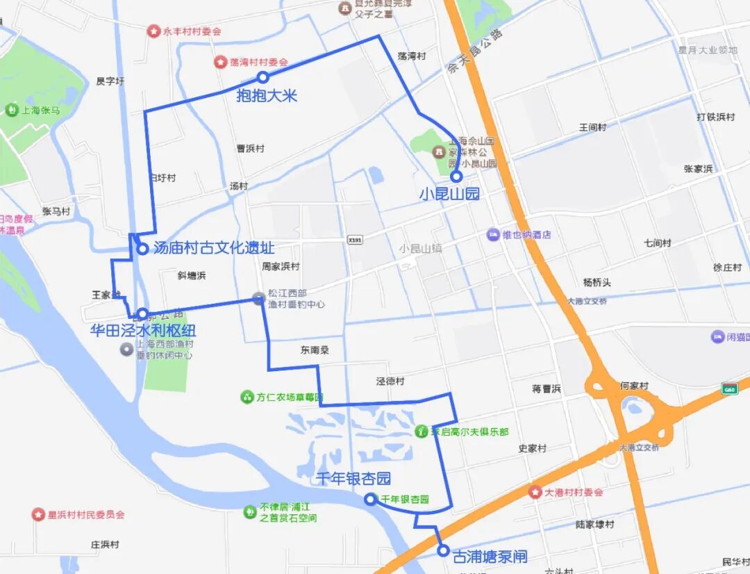 小昆山园→抱抱大米→汤庙村古文化遗址→华田泾水利枢纽→古浦塘泵闸→千年银杏园