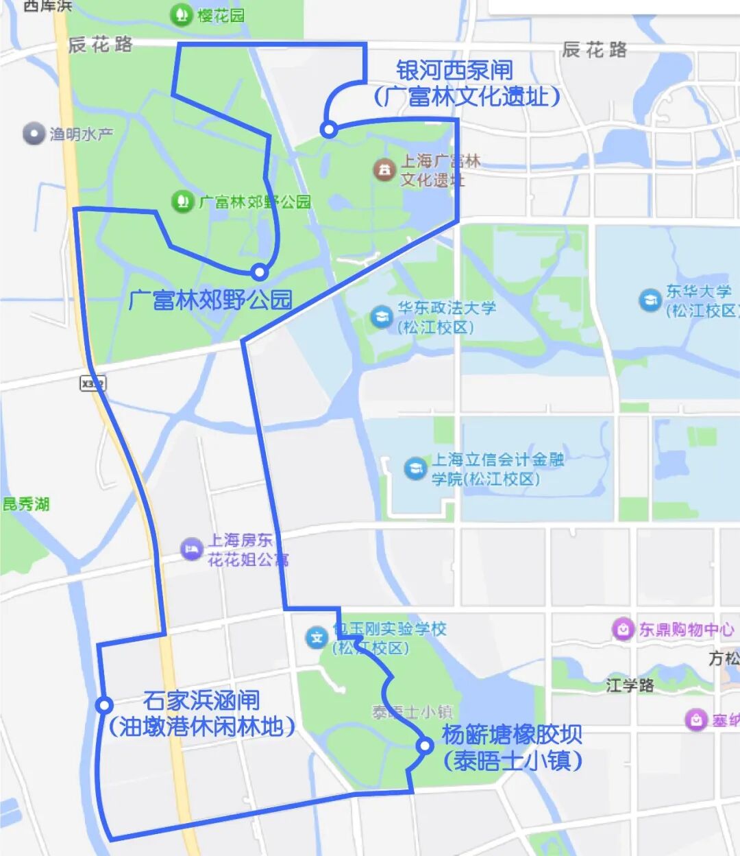 石家浜水闸(油墩港休闲林地)→杨簖塘橡胶坝(泰晤士小镇)→银河西泵闸(广富林文化遗址)→广富林郊野公园→油墩港休闲林地