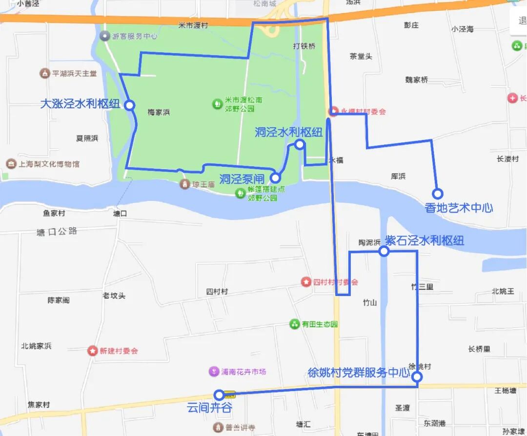 香地艺术中心→大涨泾水利枢纽→洞泾泵闸→洞泾水利枢纽→紫石泾水利枢纽→徐姚村党群服务中心→云间卉谷