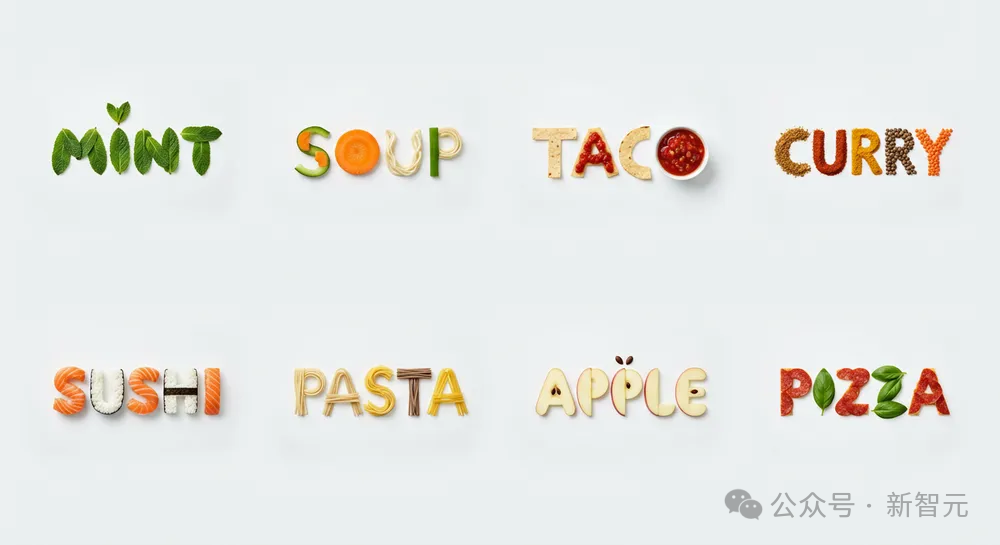 下图中,生成了一张创意美食摄影,其中每个单词都用与食物相关的实际食材,以艺术形式拼写出来。