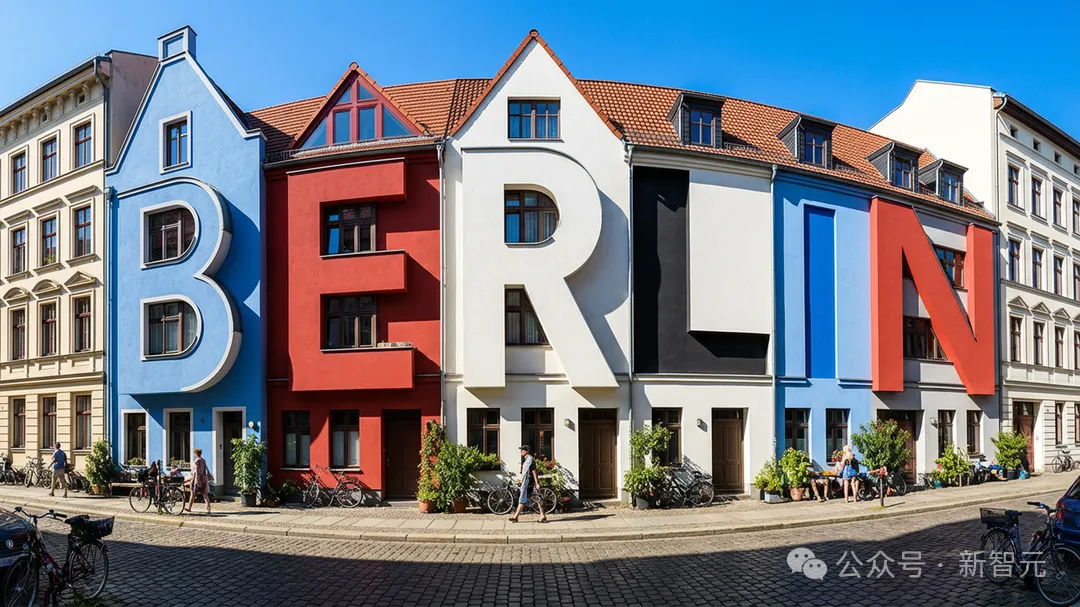 提示词:在一个阳光明媚的日子里,柏林一条舒适街道的景色,阴影鲜明。老房子形状奇特,像拼写出「BERLIN」的字母,颜色为蓝色、红色、白色和黑色。房子看起来仍然像房子,与字母的相似之处处理得很微妙