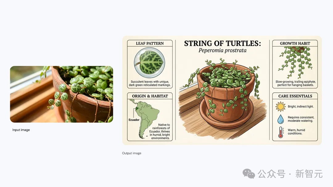 就比如,让NanoBananaPro创建一个室内植物「海龟串」(StringofTurtles)的信息图表,包含原产地、养护要点和生长习性等信息。