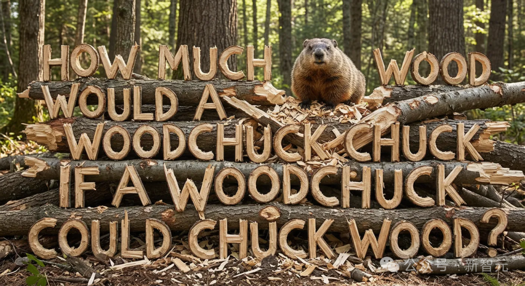 提示词:创建一张图片,显示短语「Howmuchwoodwouldawoodchuckchuckifawoodchuckcouldchuckwood」(如果一只土拨鼠能扔木头,它能扔多少木头)由土拨鼠扔出的木头拼成